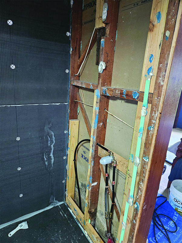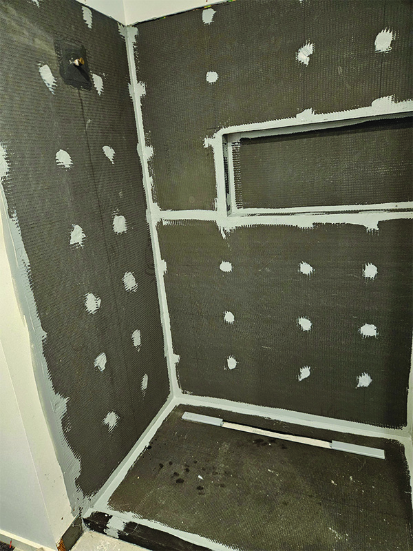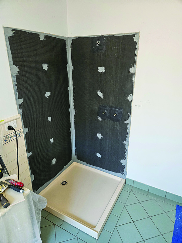 - Install Wedi shower base and wall panels